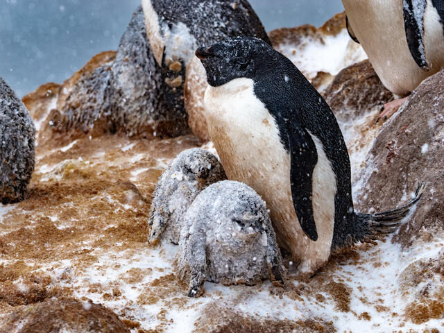 Manchot Adélie et ses poussins sous la neige - 11494 - Cusa Bruno